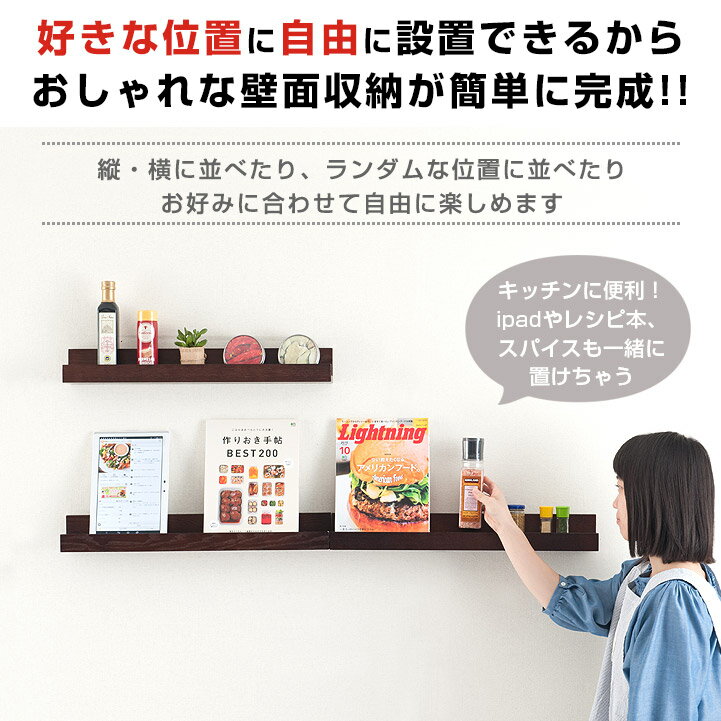 ウォールシェルフ 壁掛け飾り棚ナチュラルNKB-M60NA、ブラウンNKB-M60BR サイズ (約)幅60×奥行9×高さ8cm 耐荷重 約3kg(下記の詳細参照) 素 材 本体:天然木化粧、繊維板 表面塗装仕上げ ラッカー塗装 JANコード NKB-M60NA:4549813872092 NKB-M60BR:4549813872108 セット内容・付属品 <1個あたりの付属品>本体×1、専用フック×2、取り付け部×4(予備×1)、キャップ×4(予備×1)、固定ピン×12(予備×3)、ネジ×4(予備×1)、取り付け用定規×1 メーカー/ブランド ドウシシャ 耐荷重について ※耐荷重の目安:文庫本15冊程度で3kgになります。