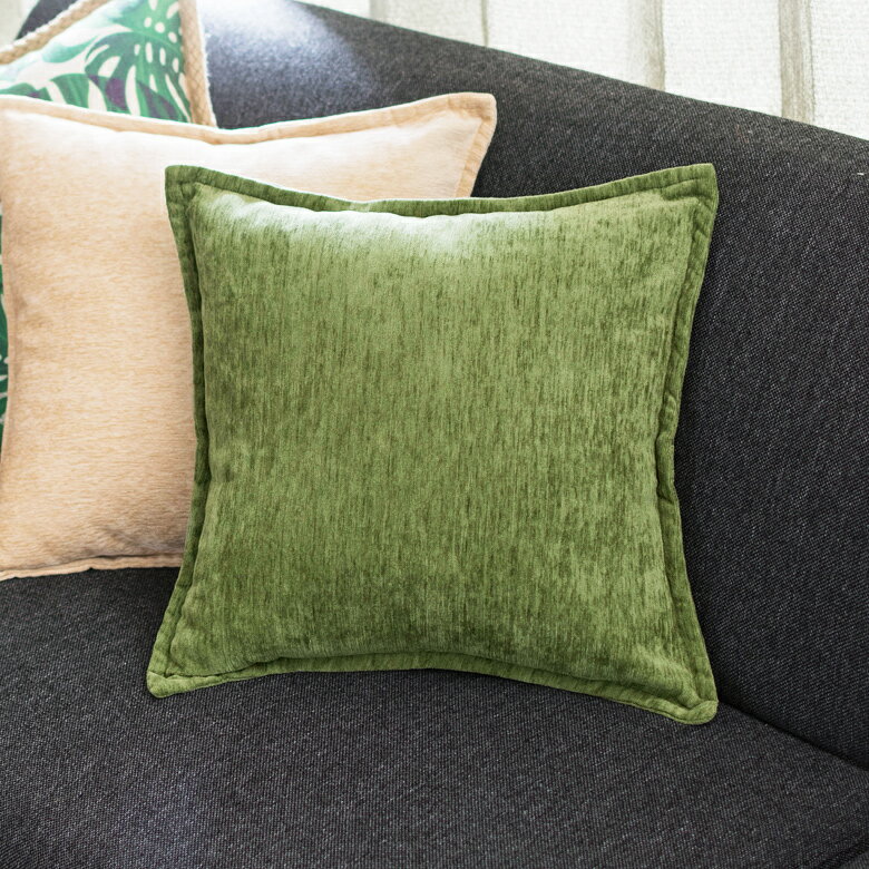 黄みの強いグリーンカラーは、植物柄のアイテムと相性抜群! リーフ柄クッションカバーはこちら >> ヴィンテージスタイルにもぴったりなブルーは、男性のお部屋にも! 単色でも無機質にならないのは、表情豊かなベロア調素材だから。
