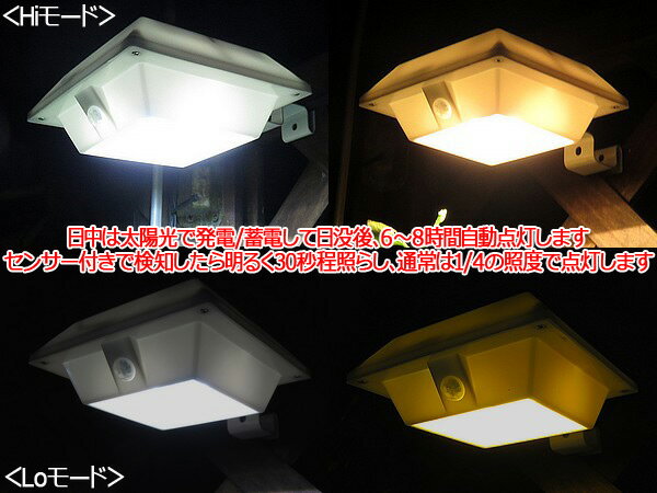 太陽光で発電し、暗くなると自動的に点灯(Loモード) 本体センサーに動きを感知すると明るく点灯(Hiモード)を約30秒行います。